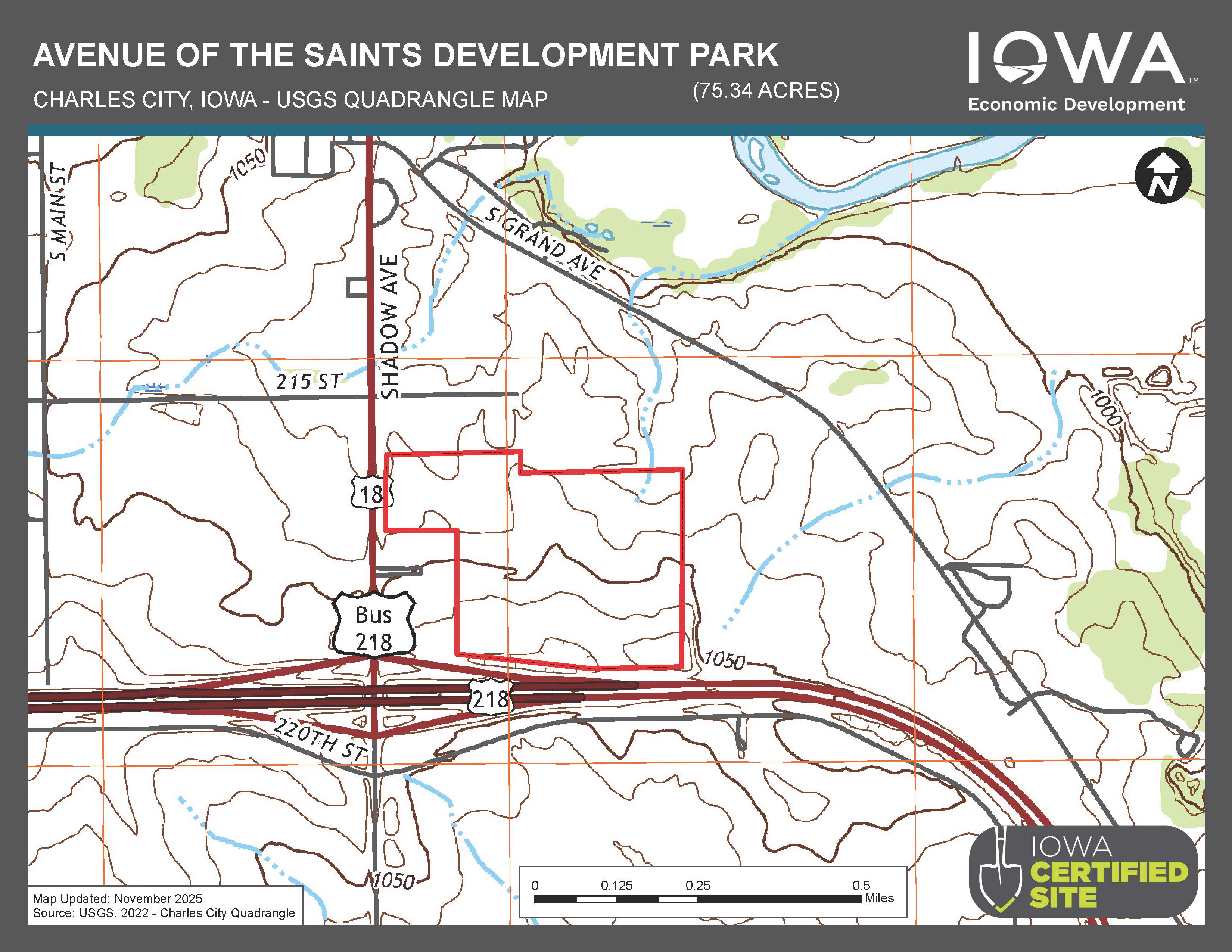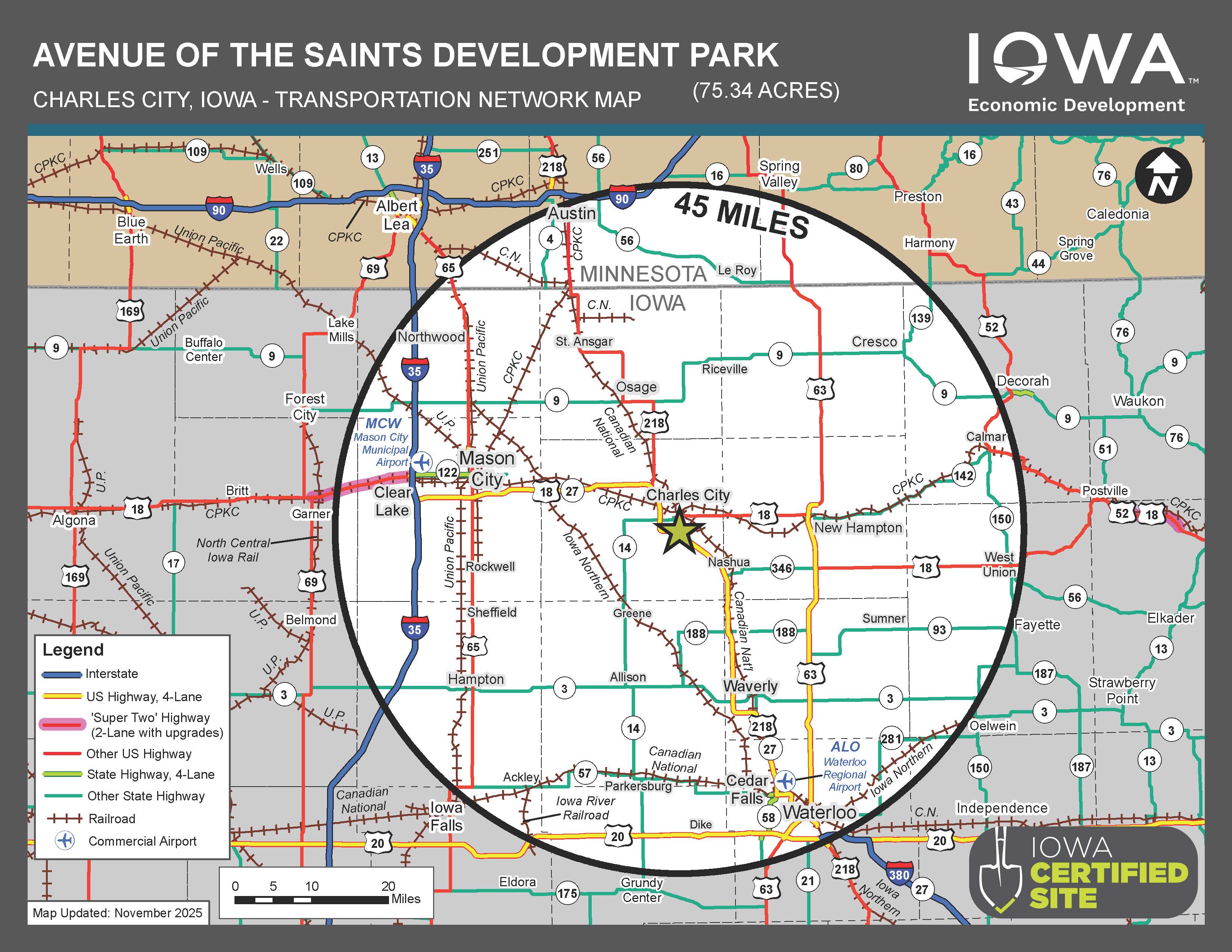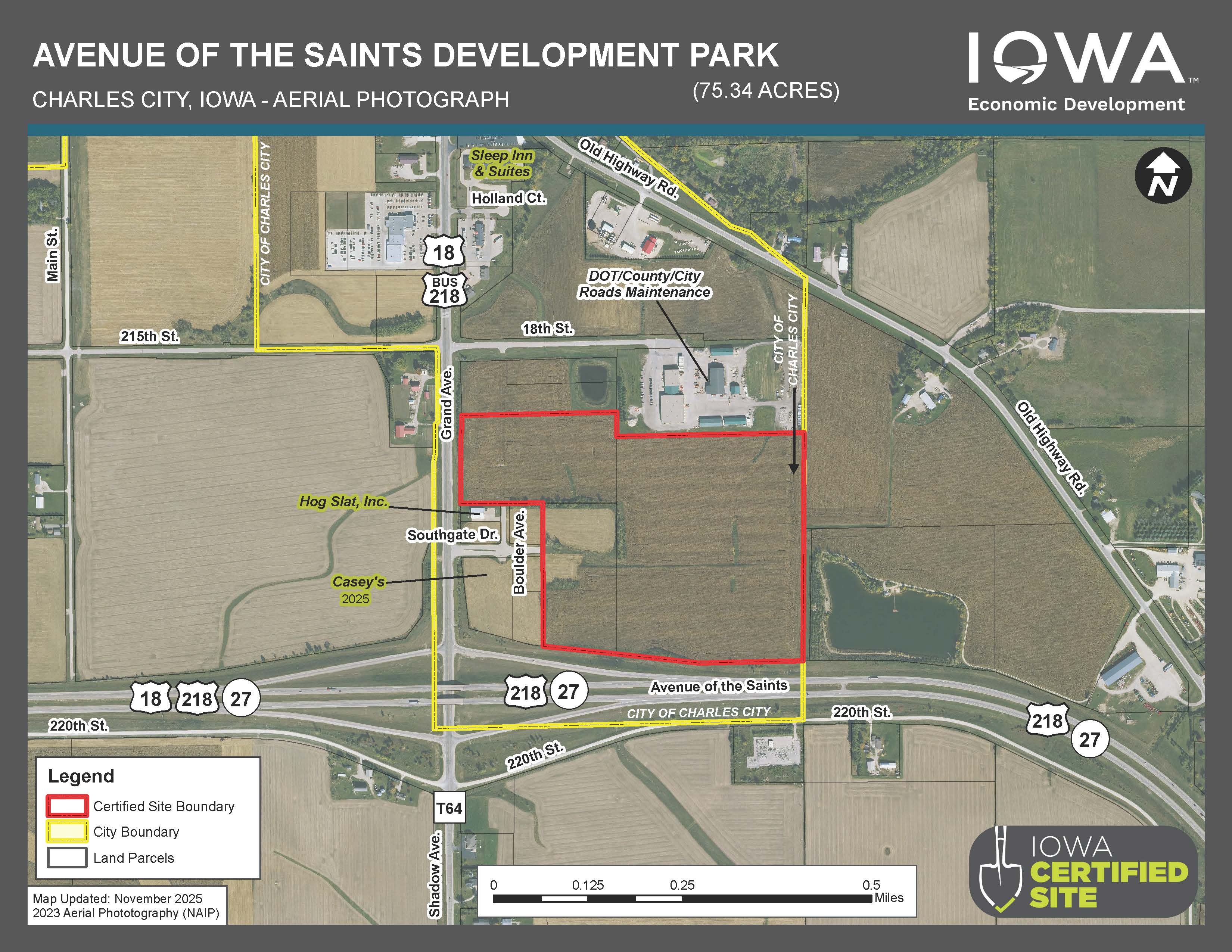 The Avenue of the Saints Development Park is a 75-acre site located at the juncture of the Avenue of the Saints four-lane thoroughfare and South Grand Avenue, Charles City, Iowa. Location on the Avenue of the Saints renders it easily accessible to transportation and major cities. It is situated within Charles Cityβs South Grand Tax Increment Financing District.