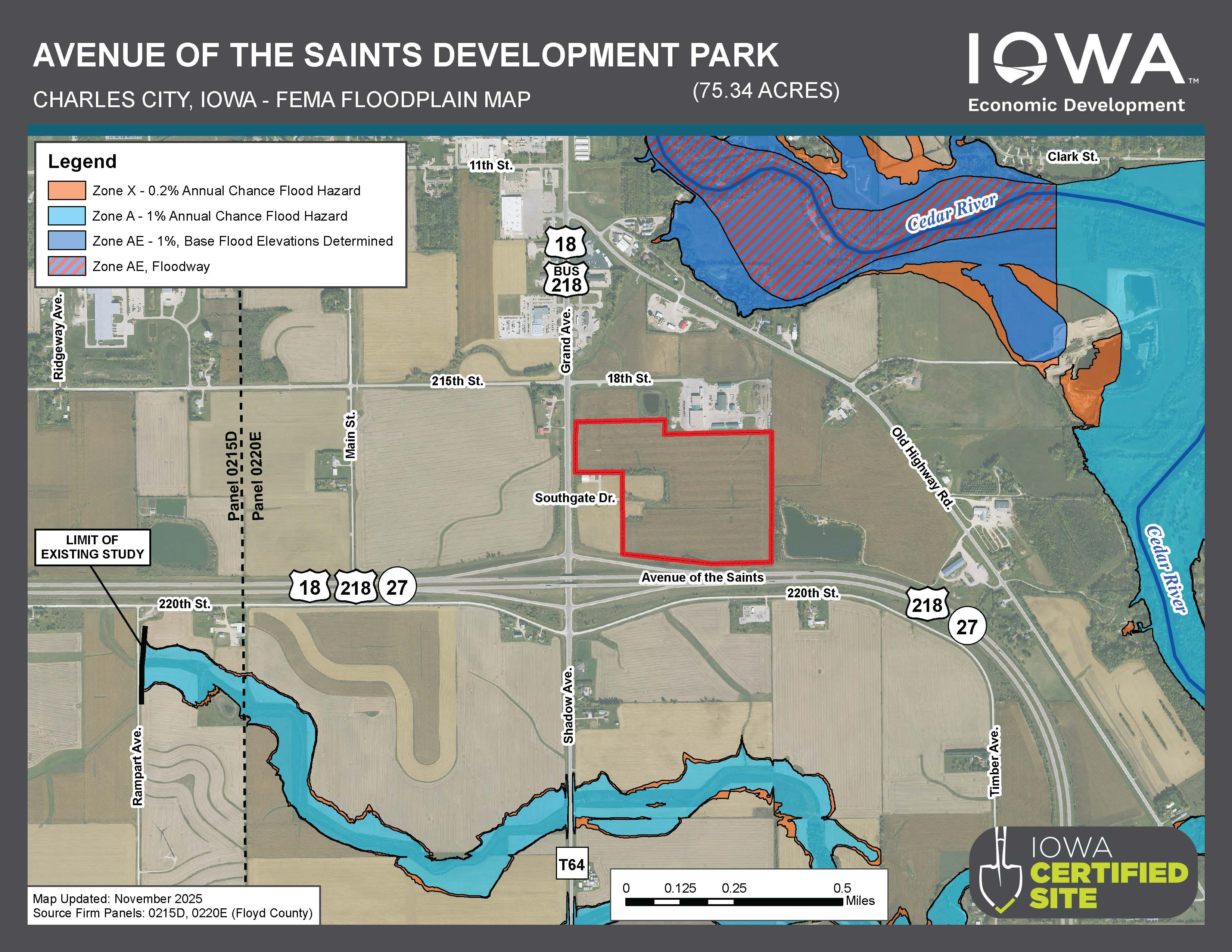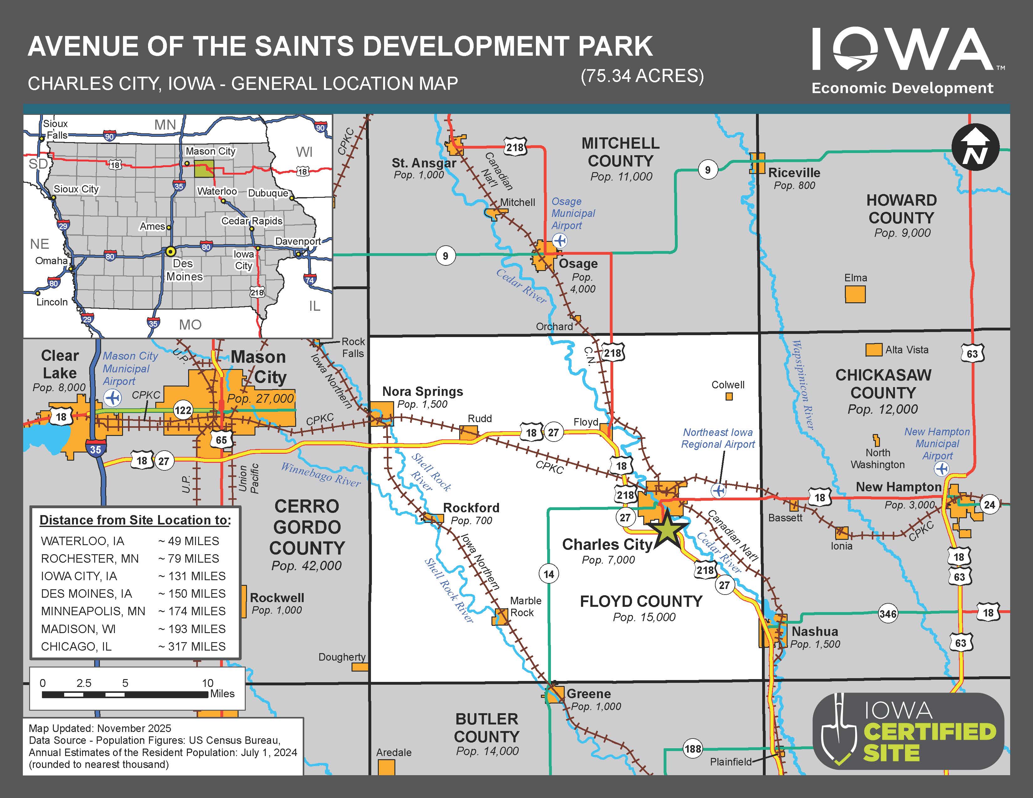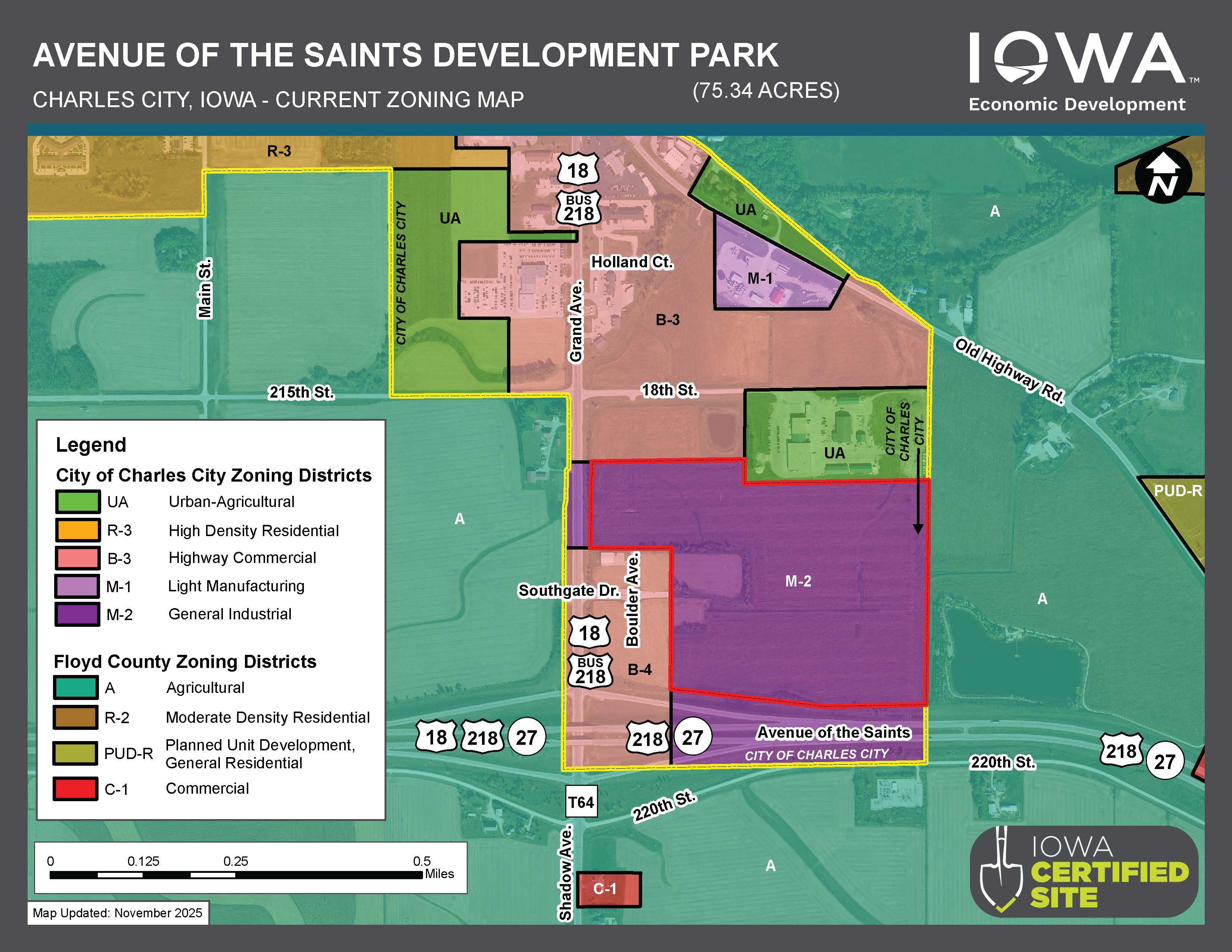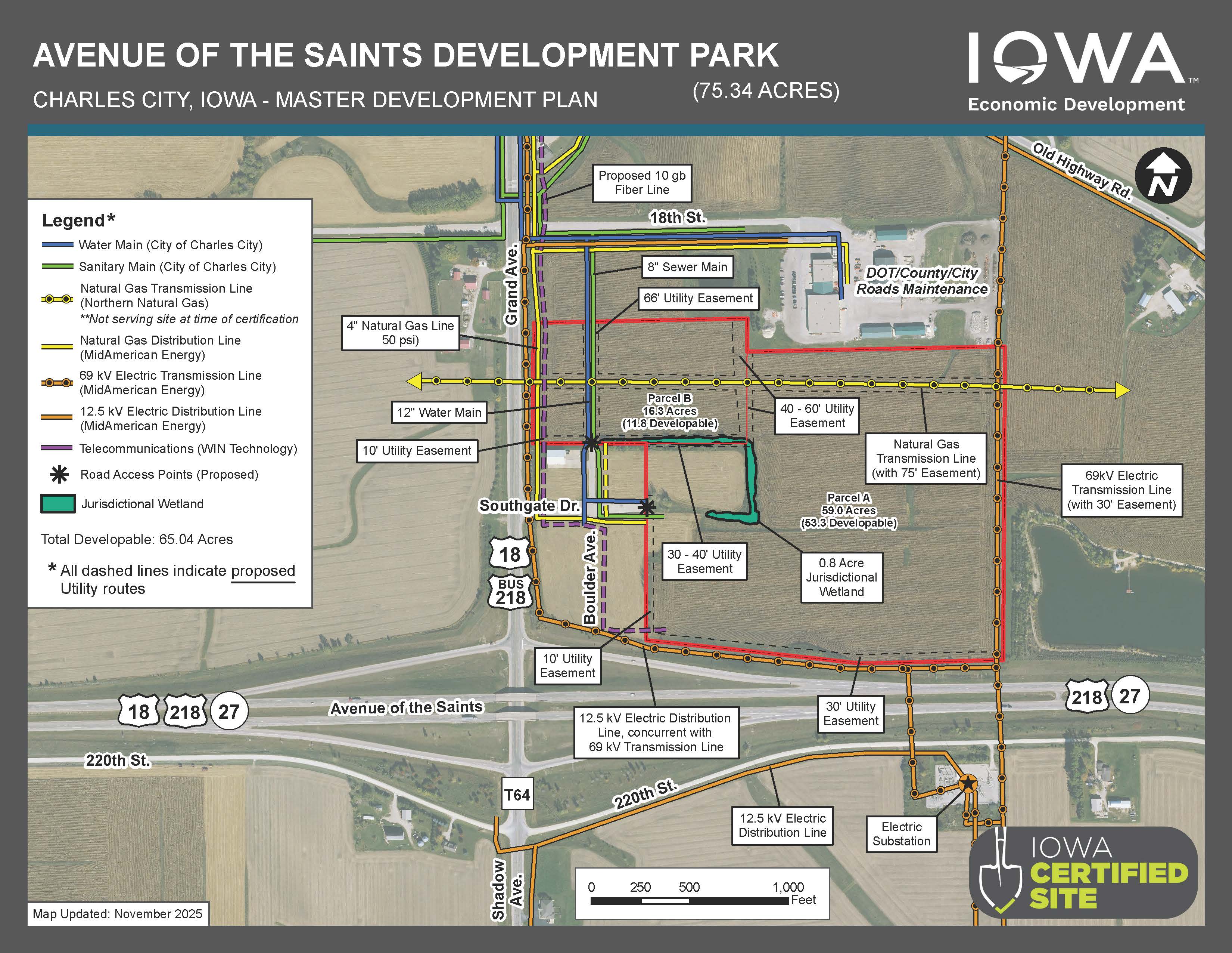 The Avenue of the Saints Development Park is a 75-acre site located at the juncture of the Avenue of the Saints four-lane thoroughfare and South Grand Avenue, Charles City, Iowa. Location on the Avenue of the Saints renders it easily accessible to transportation and major cities. It is situated within Charles Cityβs South Grand Tax Increment Financing District.