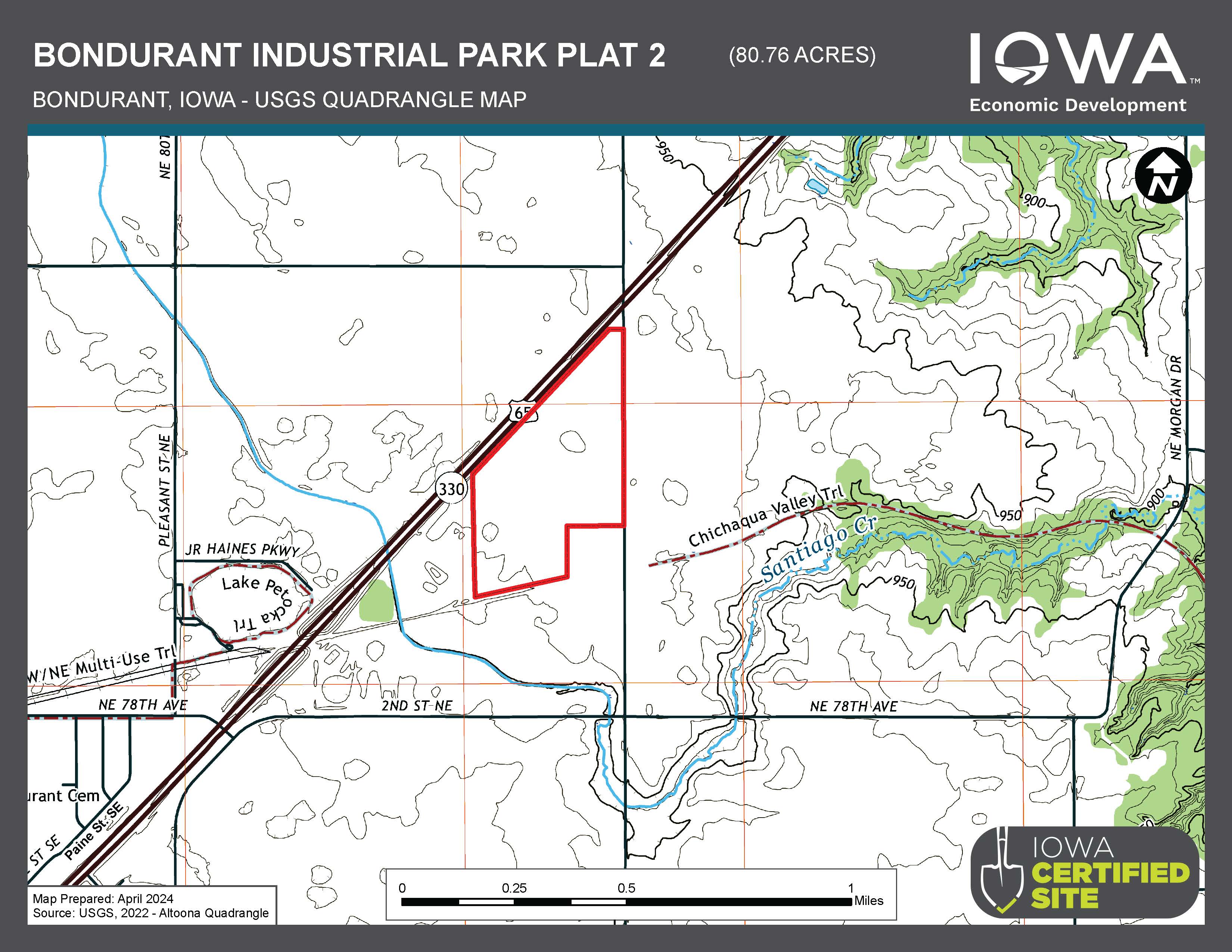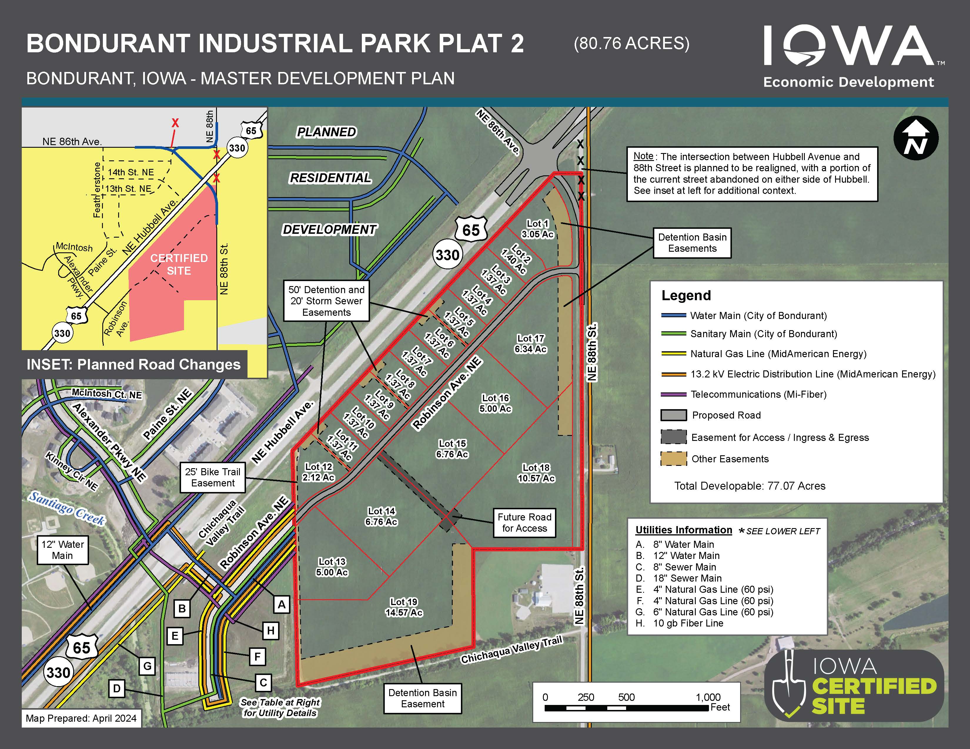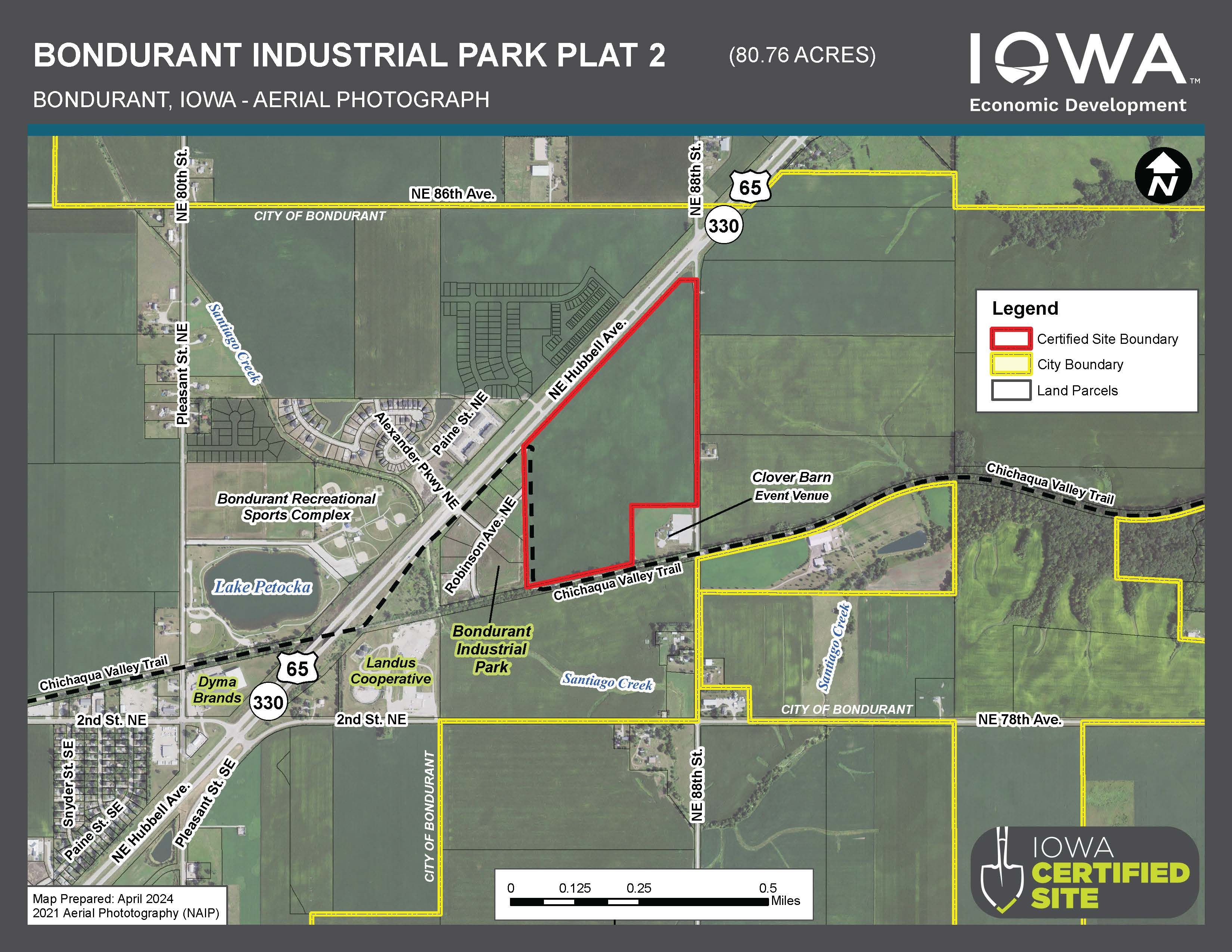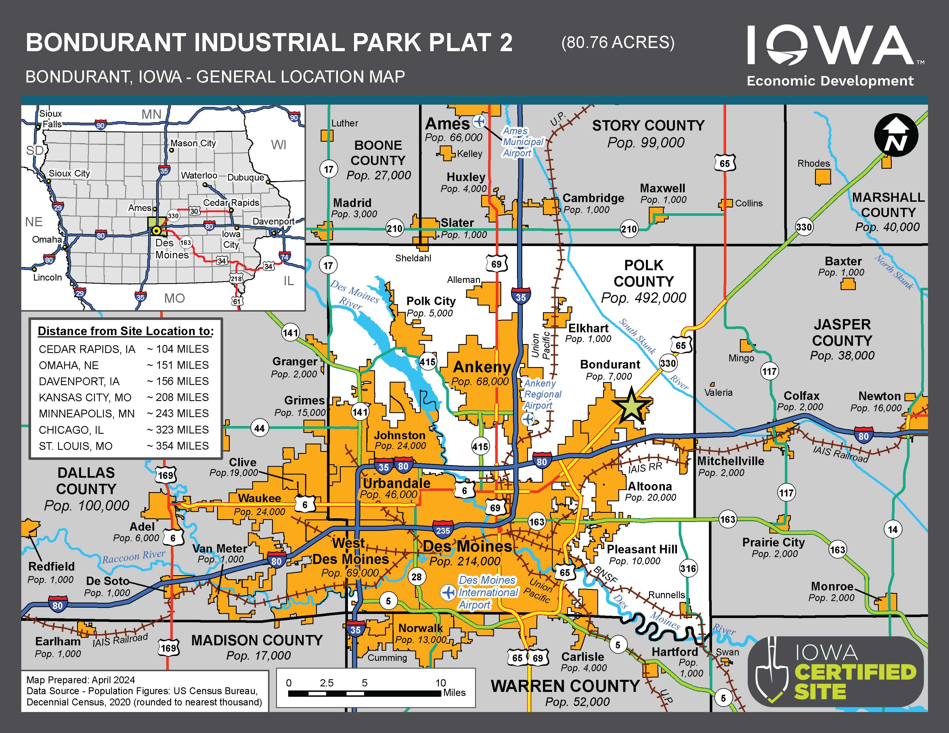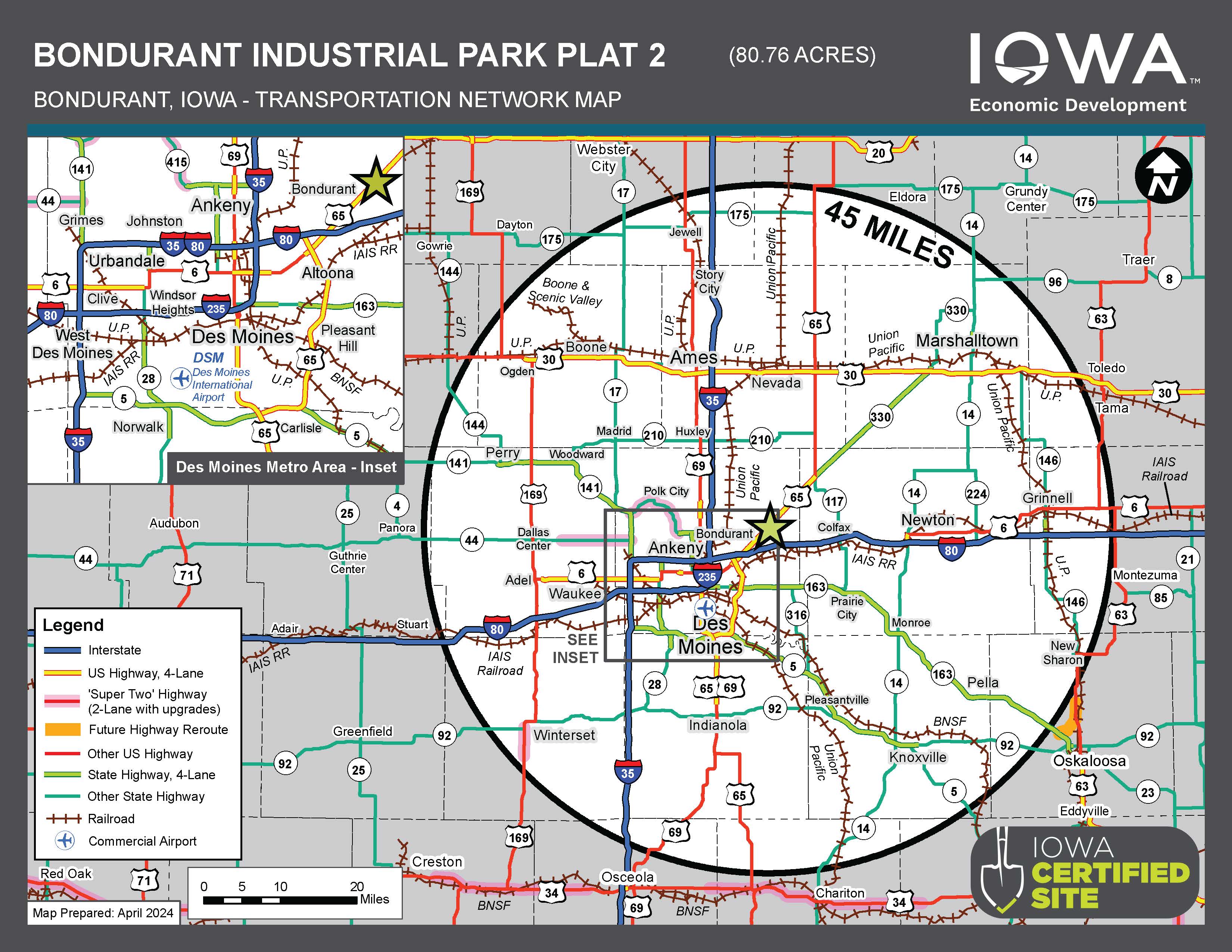 The Bondurant Industrial Park Plat 2 Certified Site is a greenfield site comprised of 80.76 acres in Bondurant’s city limits along Highway 65 and adjacent to the existing Bondurant Industrial Park. This industrial park site is ideal for businesses needing quick access to major surface transportation corridors. I-80 is only three minutes south of the site. This site has convenient access to the Des Moines International Airport (28-minute drive time) and the Ankeny Regional Airport (13-minute drive time).