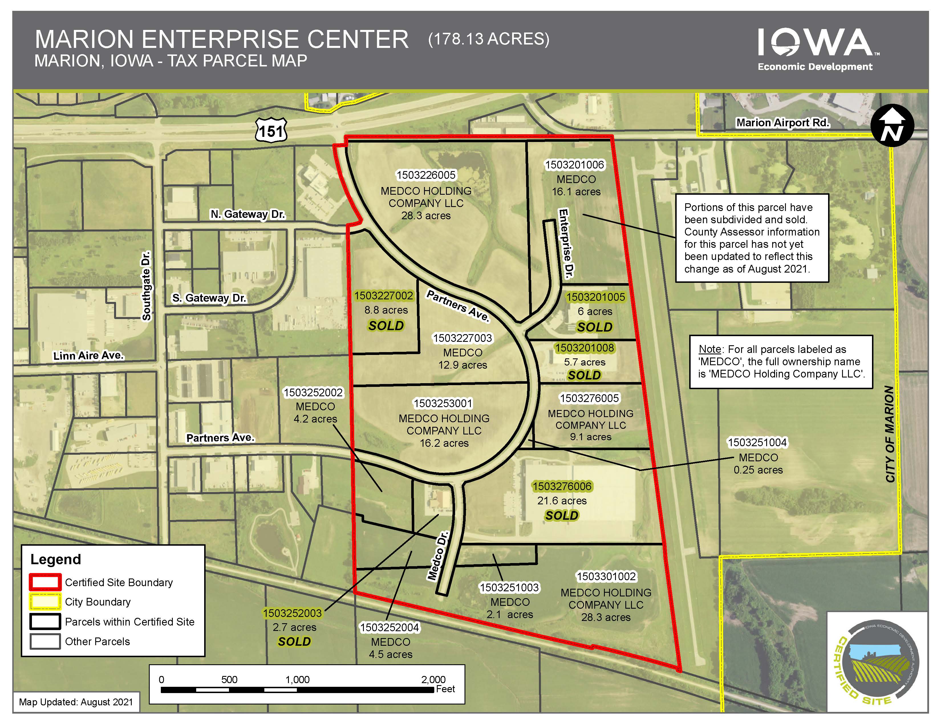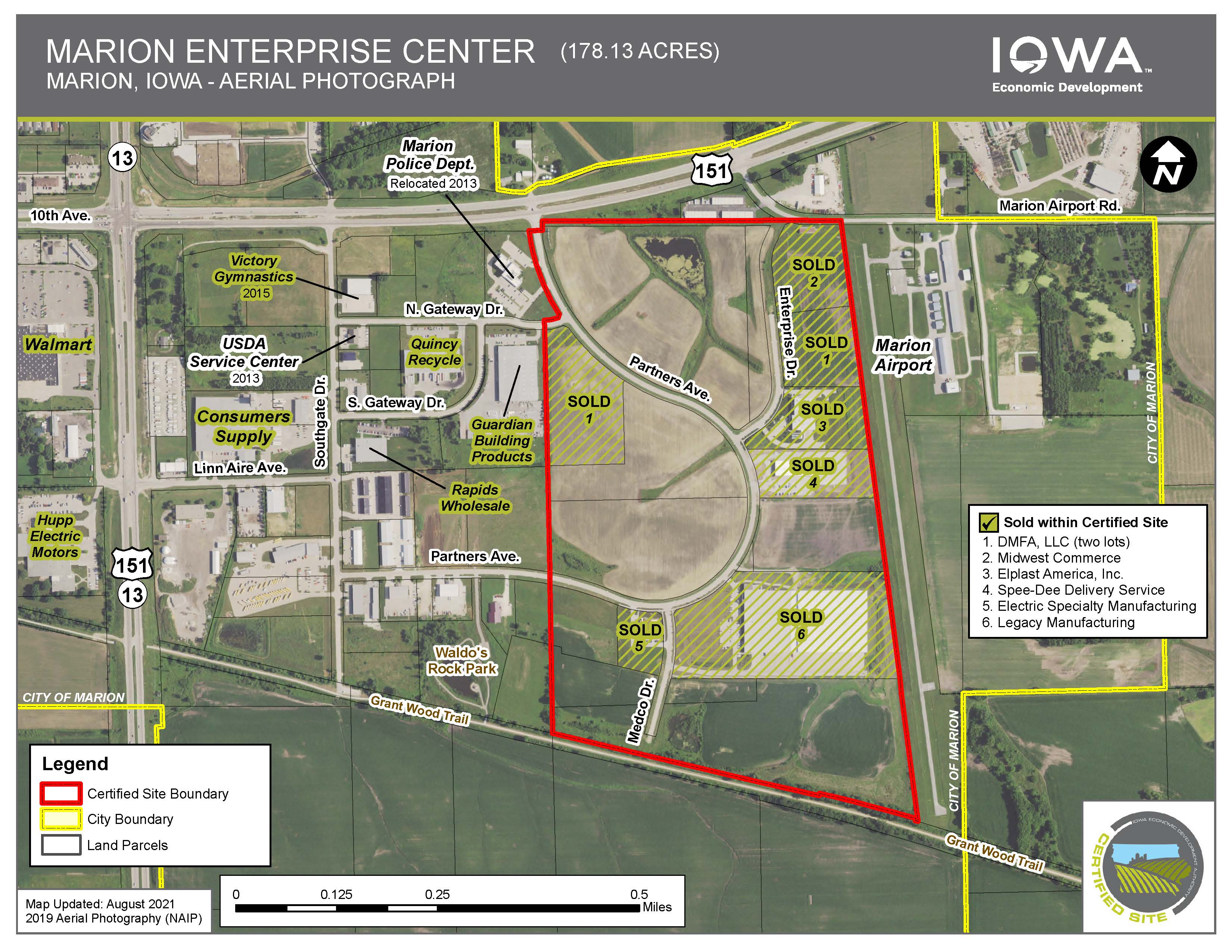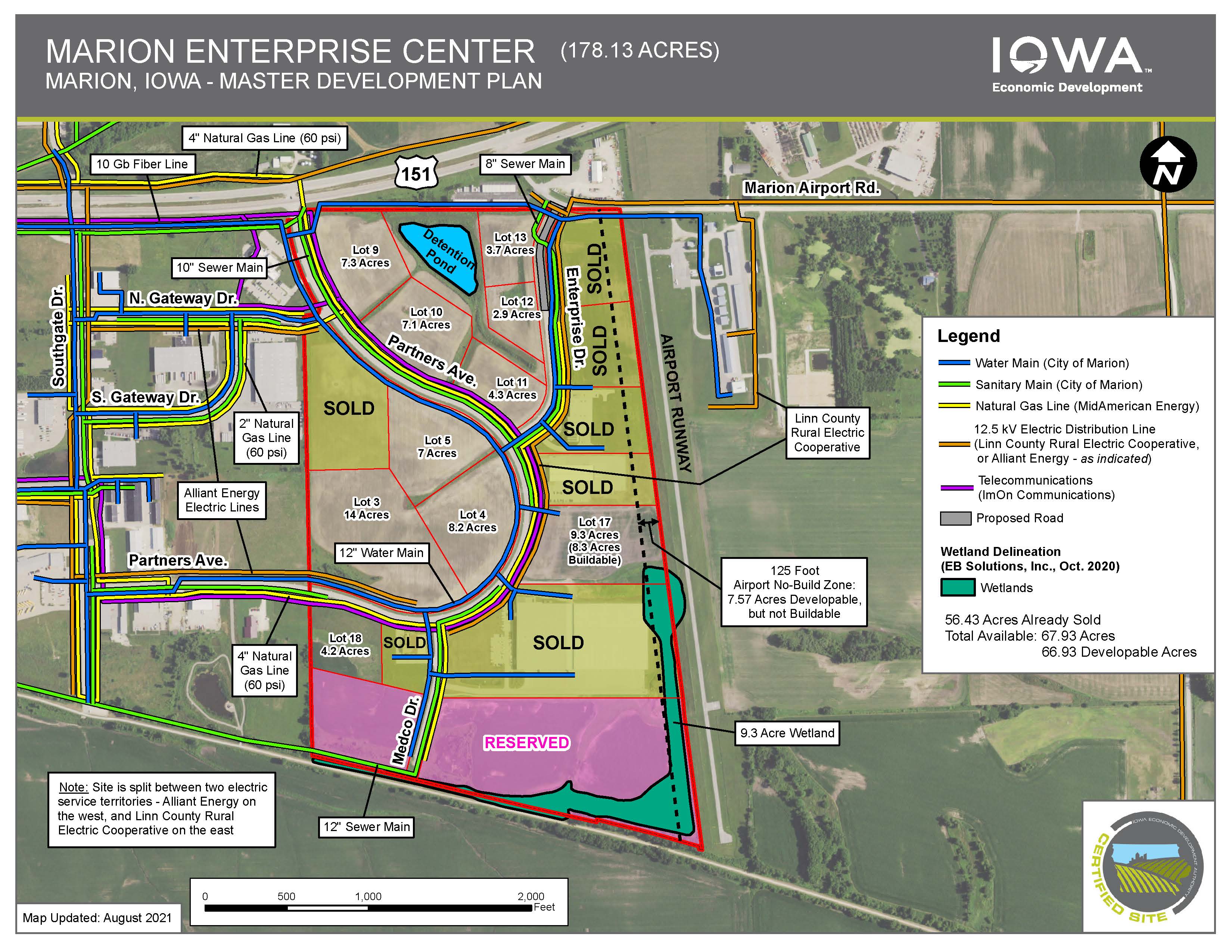 The Marion Enterprise Center (MEC) is the premier general industrial park in the Cedar Rapids metro. The certified park features fully developed and preliminary platted lots, allowing companies to easily select lot size and location. Individual lots range in size from four to 29 acres. All infrastructure including electric, water, storm sewer, sanitary sewer, fiber and natural gas are installed and ready for quick connection. Due diligence requirements and studies including environmental, geo-tech boring, wetland and archaeological reports have been completed and are available upon request.