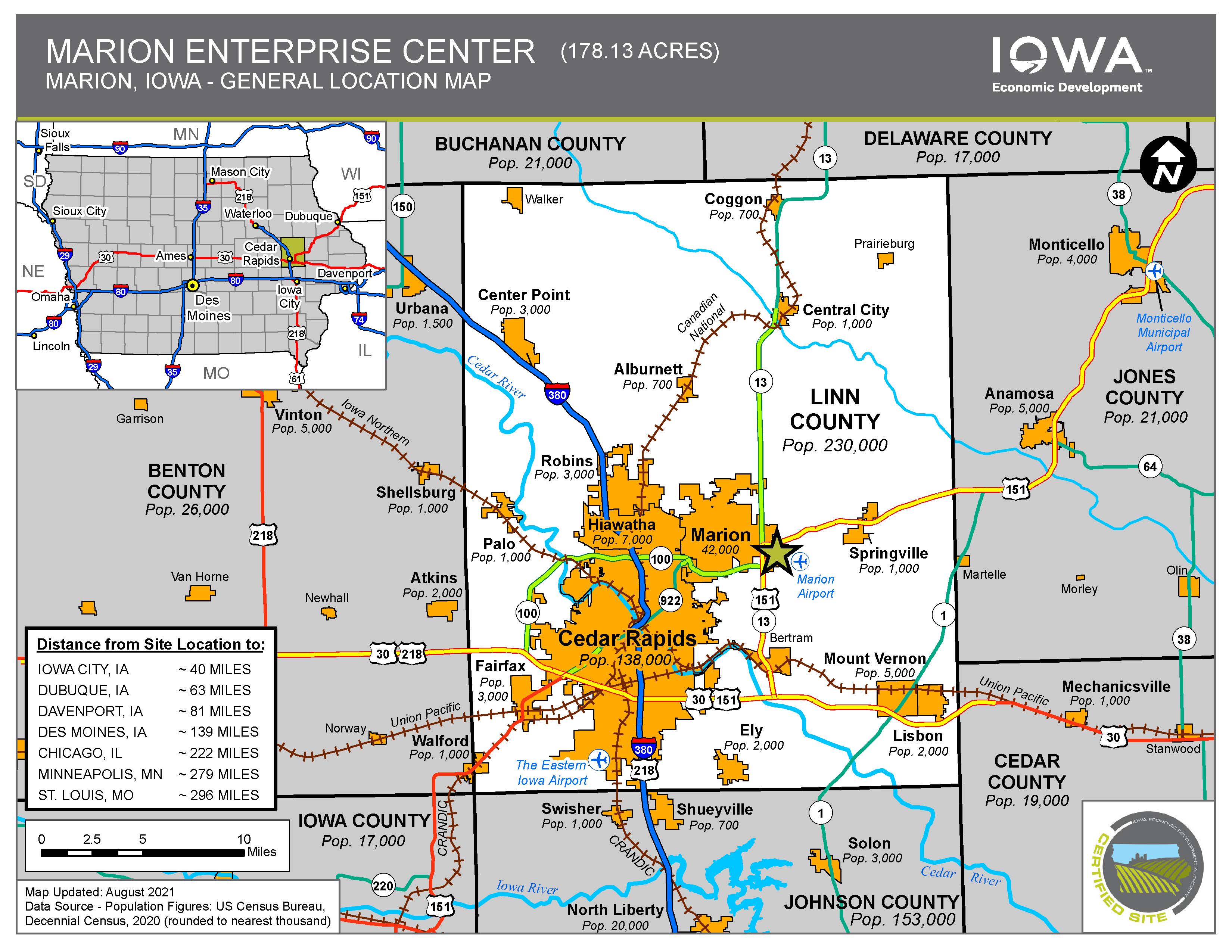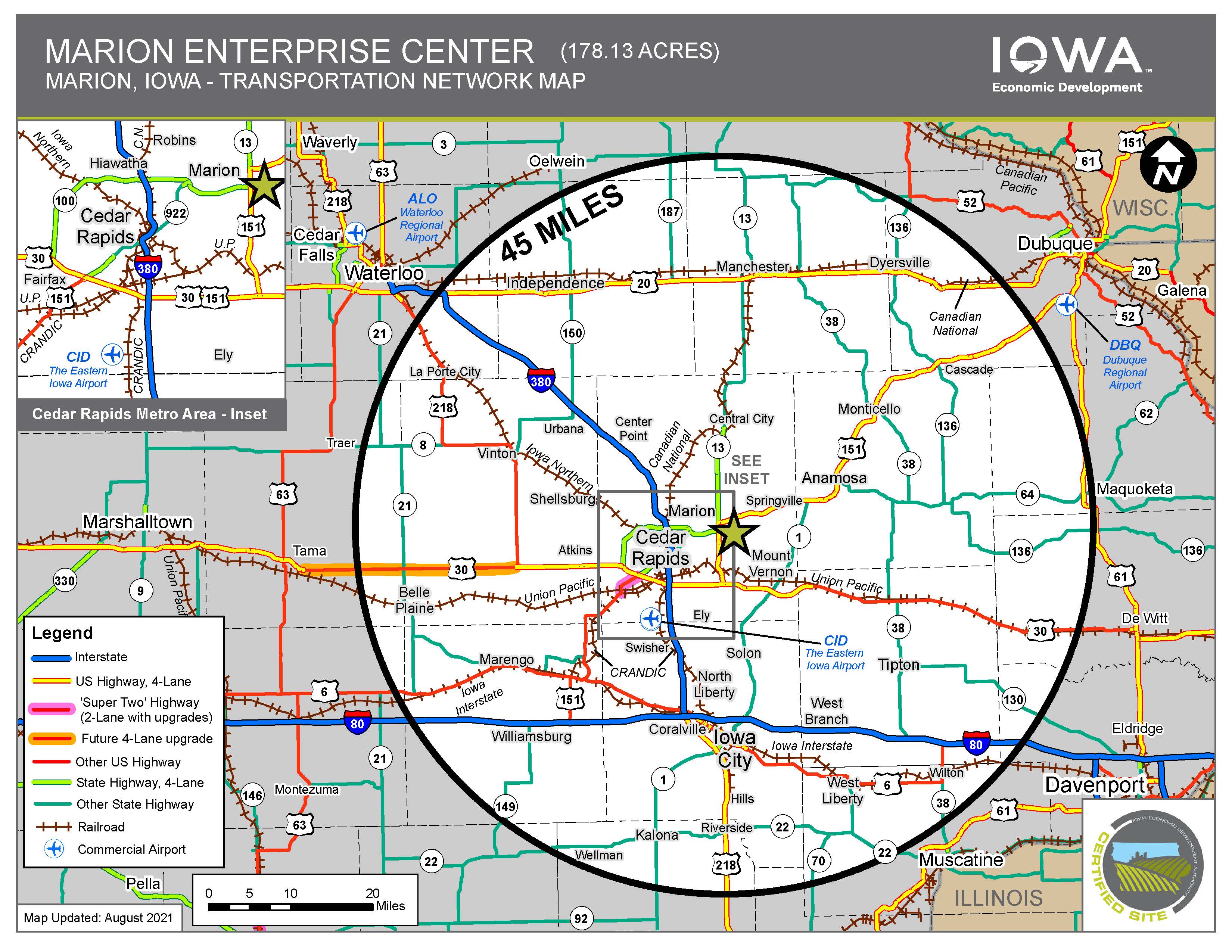The MEC is bordered by two, four-lane highways (151 on the north and 13 to the west) with quick access to America’s Interstate Highway system. Internal park roads are built to accommodate long trucks. The MEC immediately adjoins the 4,000 ft. Marion Airport. The Eastern Iowa Airport, a general service commercial airport is within 20 minutes. The park includes bike and walking trails, deep water pond, LED lighting and native plantings to ensure the best environment for employees. Fiber infrastructure also provides direct connectivity to a world class data center that offers an environment for the highest speed and most demanding data users. The publicly owned, redundant and looped data ring provides a competitive advantage over other data rich environments.