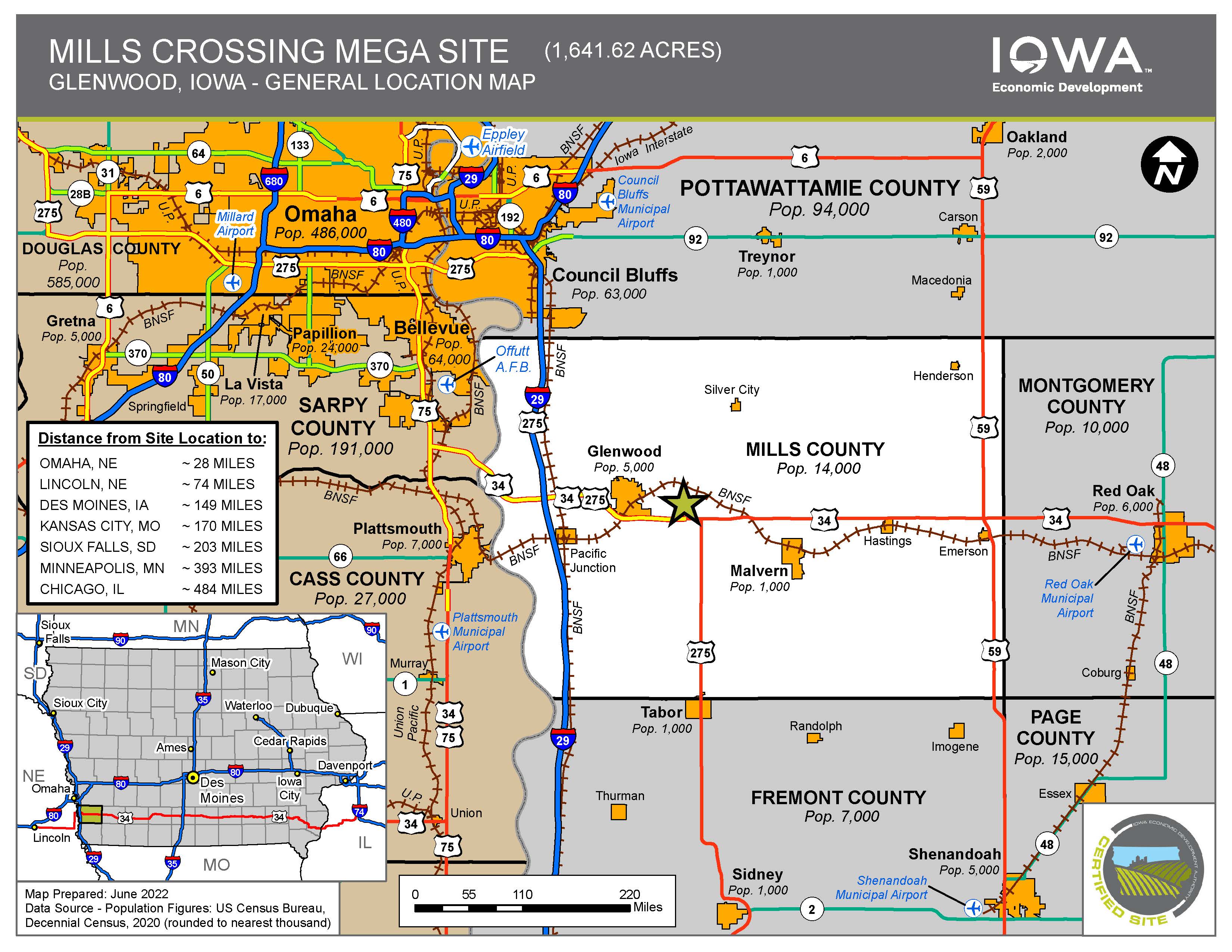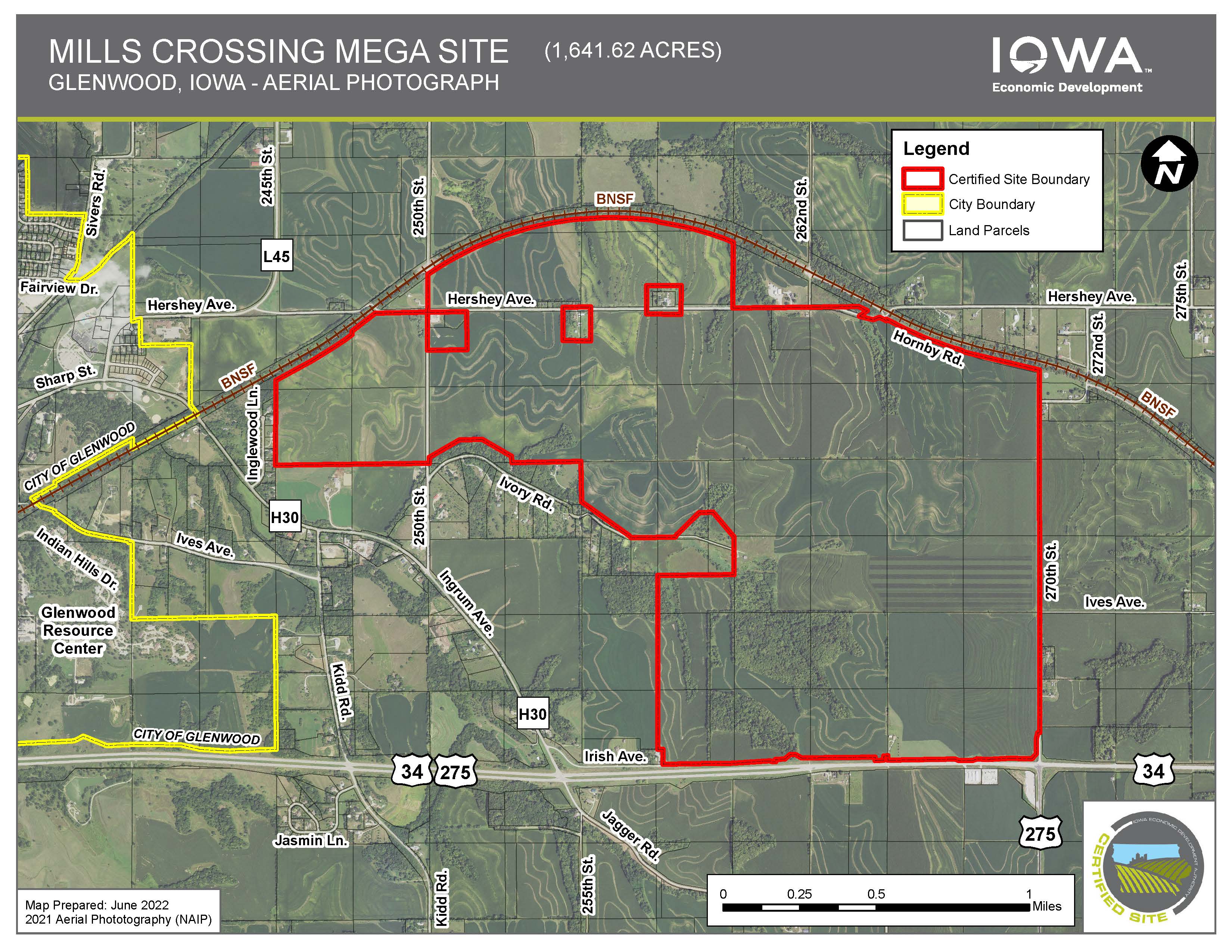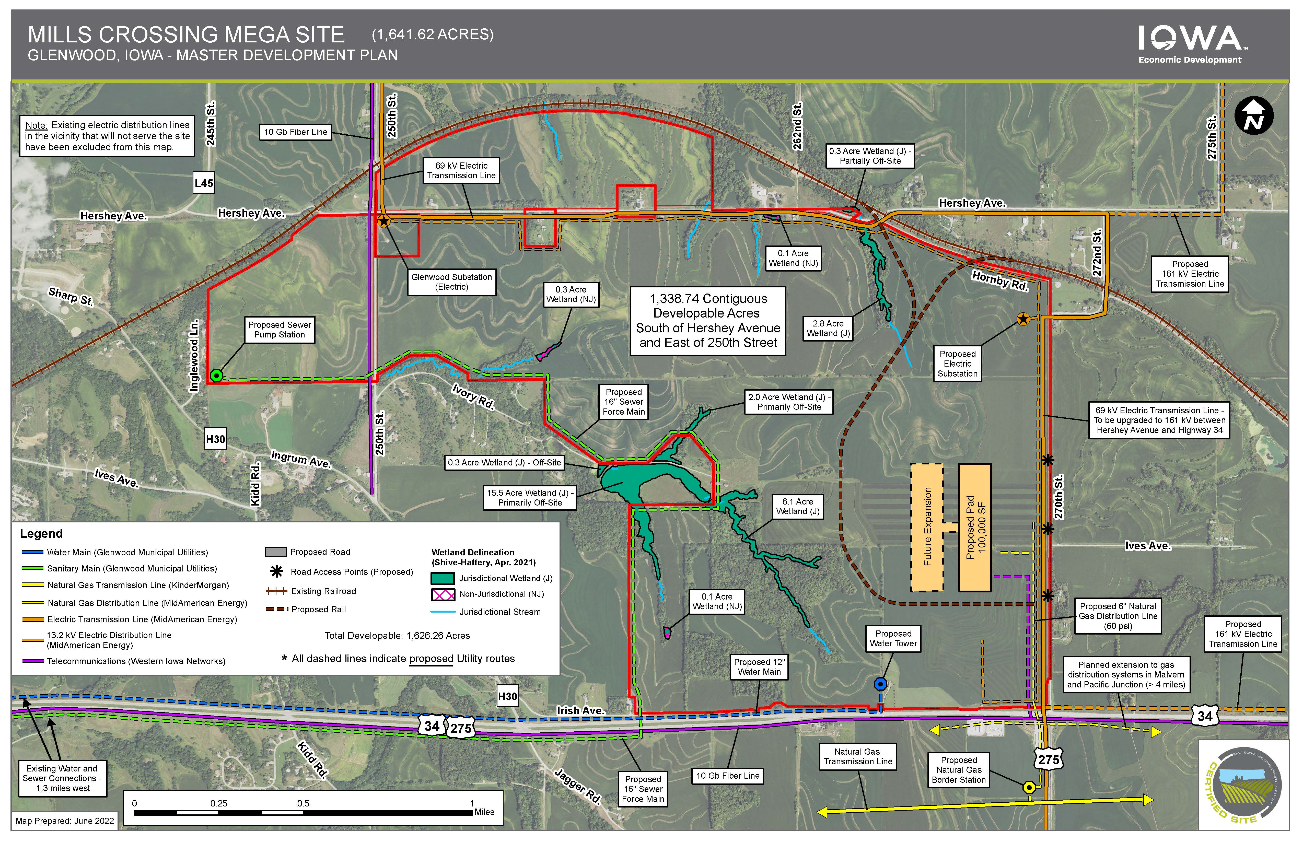 The site is located on a BNSF Railways dual track main line and is minutes from I-29 and I-80 via 4-lane Highway 34. Mills Crossing is fully served by MidAmerican's electric and natural gas systems. MidAmerican offers the 11th lowest electric rates in the U.S. and leads the nation in deployment of renewable generation with 88.5% of customers’ electric load served with renewable resources on an annual basis. Robust fiber optics are onsite, and water/wastewater service can be readily and economically extended for a wide variety of uses.