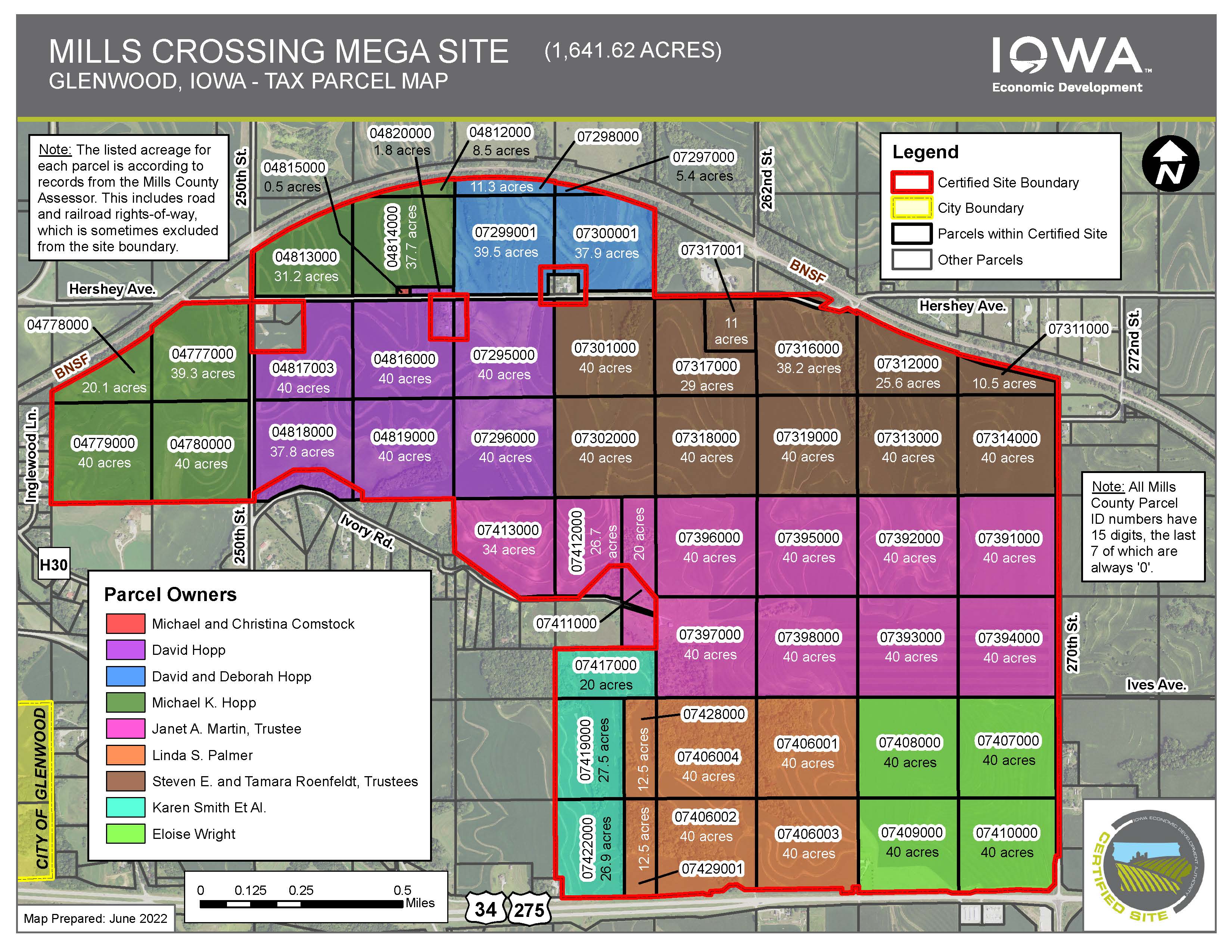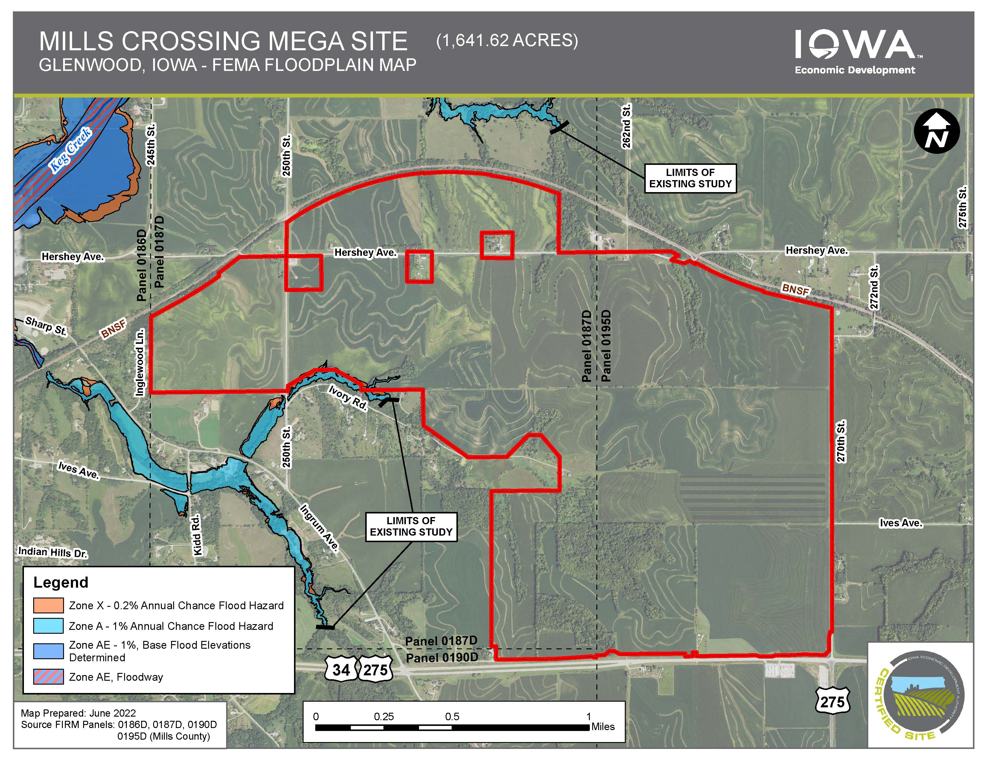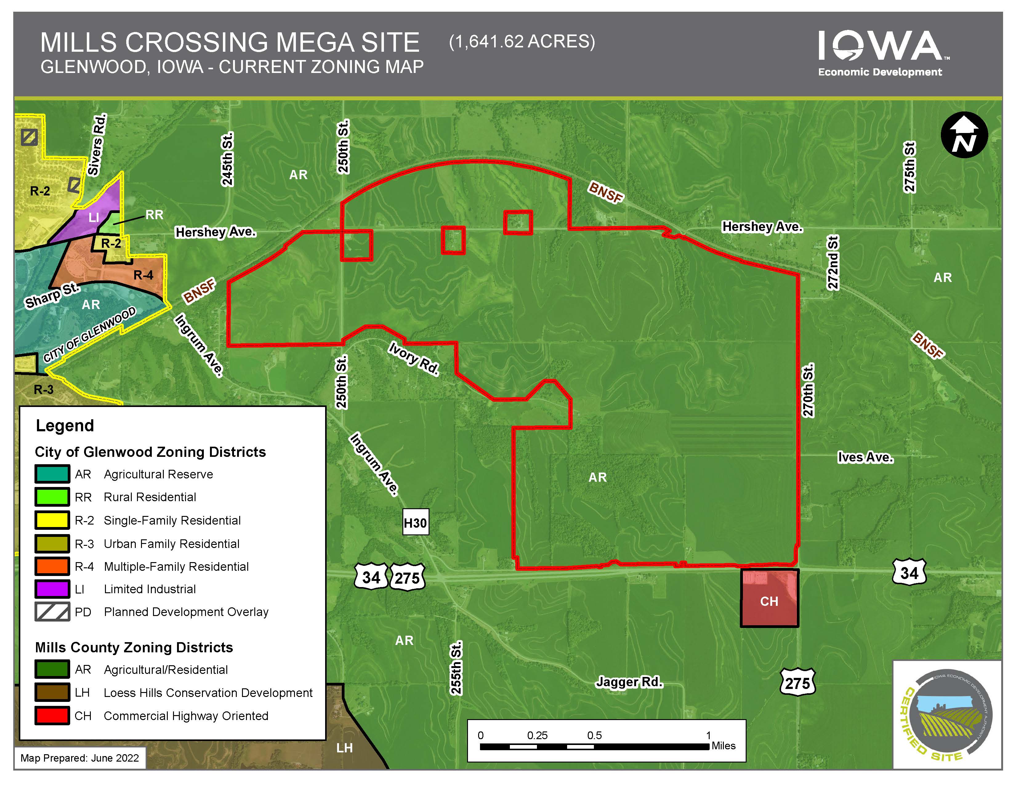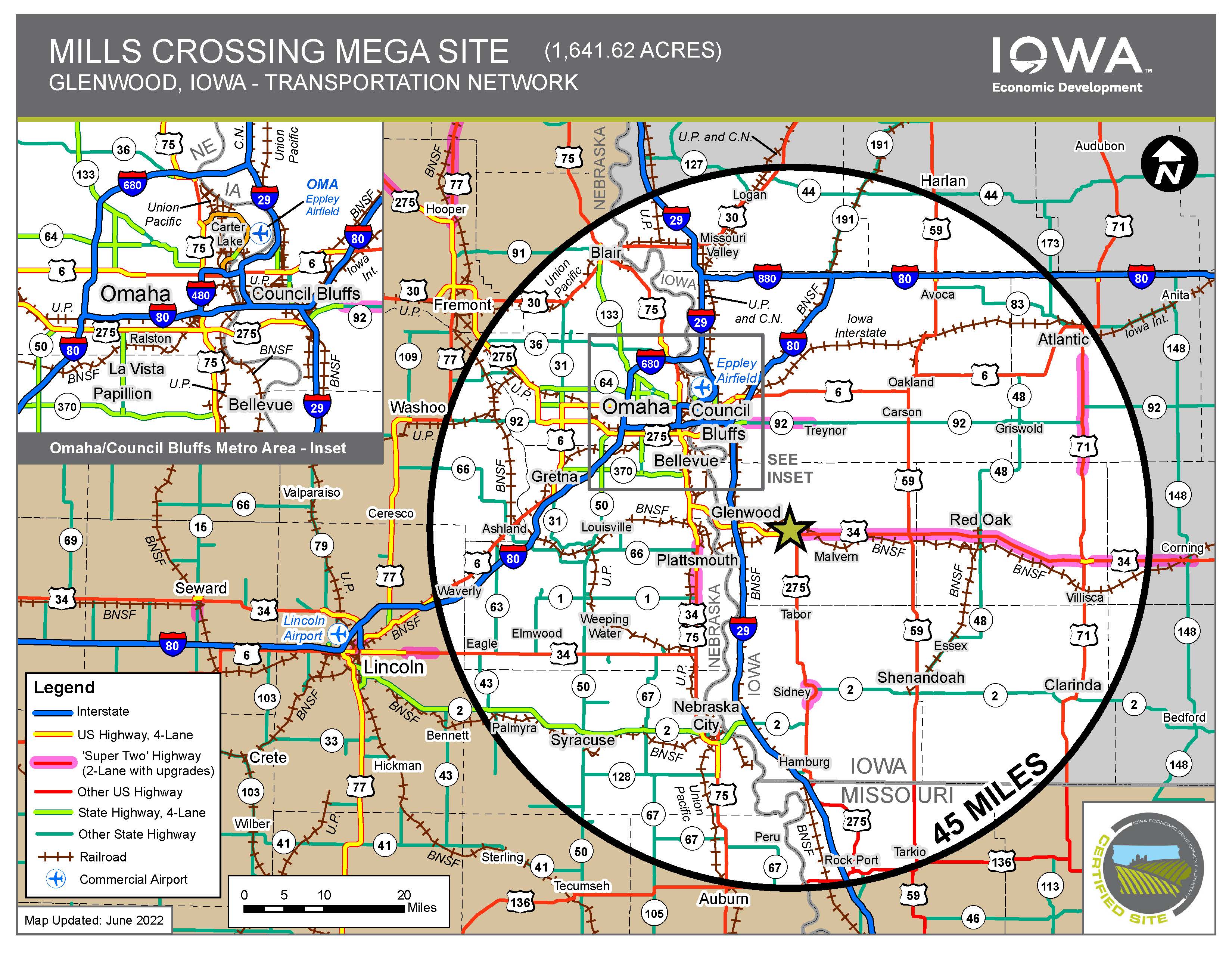 The site is located on a BNSF Railways dual track main line and is minutes from I-29 and I-80 via 4-lane Highway 34. Mills Crossing is fully served by MidAmerican's electric and natural gas systems. MidAmerican offers the 11th lowest electric rates in the U.S. and leads the nation in deployment of renewable generation with 88.5% of customers’ electric load served with renewable resources on an annual basis. Robust fiber optics are onsite, and water/wastewater service can be readily and economically extended for a wide variety of uses.
