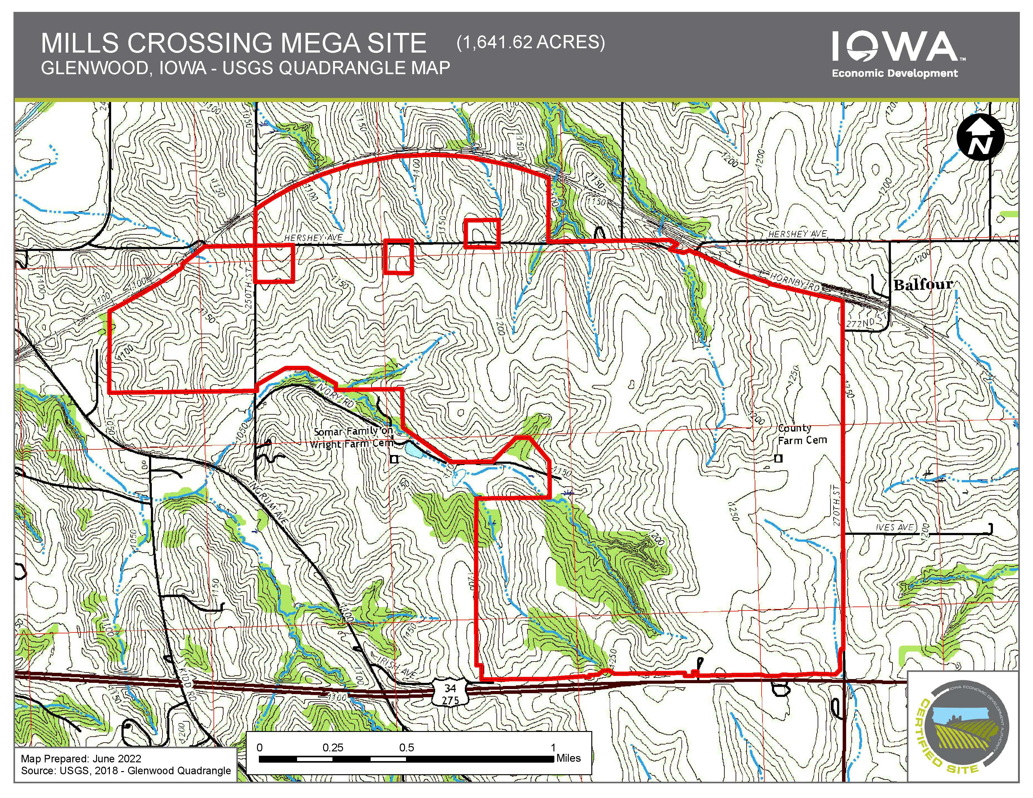 Mills Crossing is a development-ready mega site certified by Quest Site Solutions through the Iowa Economic Development Authority's Certified Sites program. As a certified mega site, Mills Crossing offers prospective users a strategic advantage for rapid development, access to a population center of 1 million+ people, and a location in the central United States connected to markets and ports throughout the country.